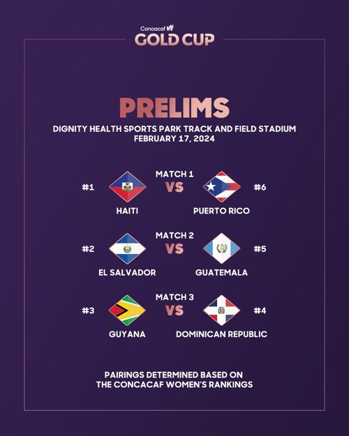 The 2024 Concacaf W Gold Cup will begin with the Prelims at Dignity Health Sports Park Track and Field Stadium on February 17, 2024. The six national teams participating in this round have been divided into three pairings according to the Concacaf Women's Rankings as of December 2023. The three pairings are as follows (highest-ranked teams versus the lowest-ranked teams):
